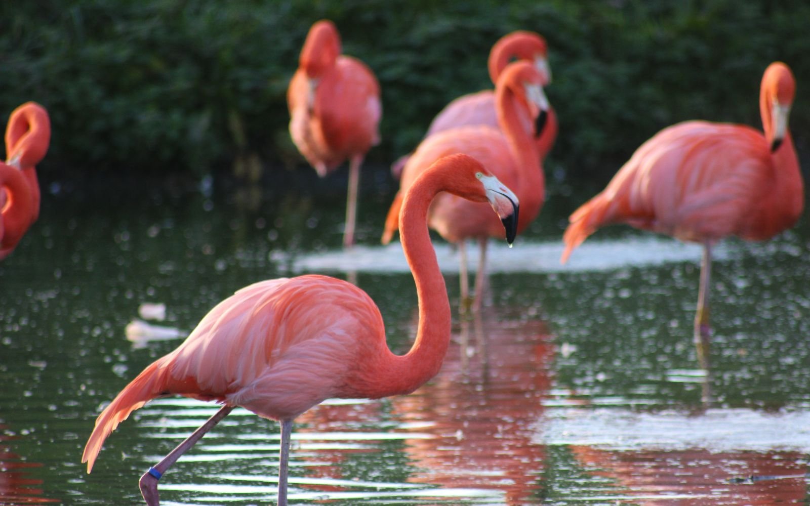 Flamingos conserve energy by standing on one leg, minimizing muscle use and maintaining balance through a narrow center of gravity.